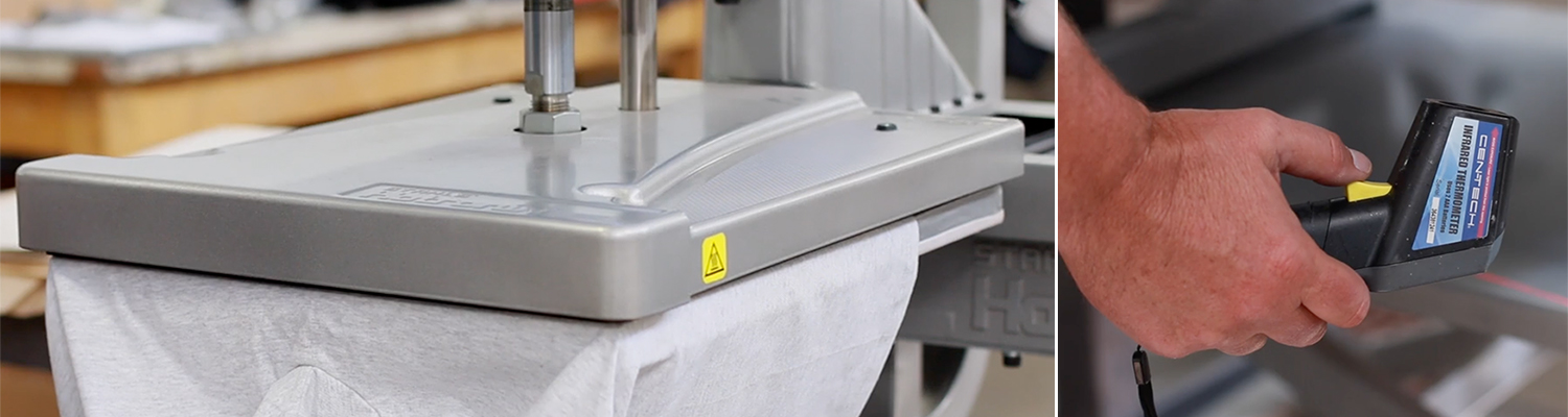 Temperature: The temperature of the heating element on the top, bottom or both. Temperature is another crucial setting that can cause some of the same issues seen above, but the most common issue is transfer failure. Not having enough heat will either cause the transfer not to adhere or worse, it looks good but fails after your customer gets it. The correct heat combined with the correct amount of time will allow the adhesives to melt to the right consistency to penetrate the fibers. Having a calibrated heat press helps insure repeated success. Keep test strips on hand as they are much more reliable than non-contact infra-red devices for testing the accuracy of the temperature of your heat press.